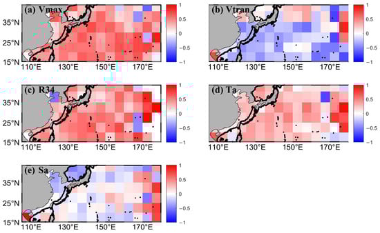 Spatial correlation patterns between maximum SST cooling and different TC and oceanic driving factors, including (a) Vmax, (b) Vtrans, (c) R34, (d) Ta and (e) Sa during 2004–2021 in the WNP. Each longitude–latitude bin is 5° × 5°, and only bins containing more than 10 TC track points are retained.
