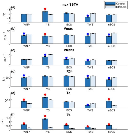 Mean (a) maximum SSTA, (b) TC intensity, (c) translation speed, (d) storm size, (e) temperature stratification, and (f) salinity stratification in coastal and offshore seas of the WNP, YS, ECS, TWS, and NSCS during 2004–2021. The dark and light blue bars indicate the coastal and offshore mean values, respectively. The circle markers indicate significant differences between coastal and offshore values at the 95% confidence level. The marker colors in each subplot indicate significantly stronger (red) or weaker (blue) coastal SST cooling or driving factors compared with the offshore.