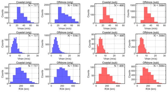 Distributions of original and subsampled Vmax, Vtrans, and R34 during 2004–2021 for TC track points in the coastal and offshore WNP. N in the upper right corner indicates the total sample size in each subplot.