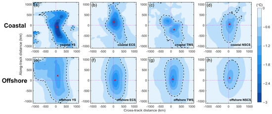In the WNP, the maximum SSTA caused by coastal TCs is −1.9 °C, comparable to the offshore TCs (−1.9 °C). The cooling area with SSTA stronger than −0.5 °C refers to the cold wake in this study, and the cold wake area by coastal TCs (101.3 × 104 km2) is comparable to the offshore (100.1 × 104 km2) (Figure 2a,c). In the YS, the maximum SSTA reaches −2.5 °C, but only −1.8 °C for the corresponding offshore TCs (Figure 3a,e), and the cold wake area (138.7 × 104 km2) is 30% smaller than that caused by offshore TCs (198.7 × 104 km2). In the ECS, the maximum SSTA by coastal TCs (−2.2 °C) is slightly larger than offshore TCs (−2.0 °C), and the coastal cold wake area (109.5 × 104 km2) is 24% smaller than the offshore area (143.8 × 104 km2) (Figure 3b,f). The magnitude and spatial characteristics are similar between the coastal and offshore NSCS, revealing that the coastal maximum SSTA (−1.7 °C) is comparable to the offshore (−1.7 °C), and the cold wake area by coastal TCs (79.3 × 104 km2) is only 17% smaller than offshore TCs (96.0 × 104 km2) (Figure 3c,g).