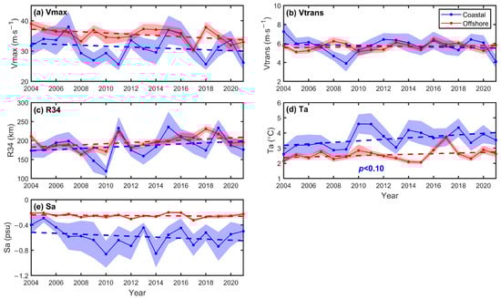 According to the previous studies, China’s coastal landfalling TCs’ threat increased significantly in the past decades [3]. Based on the analysis of coastal–offshore differences in SST cooling and their driving factors, it is important to further examine the interannual variability of these responses. Over the study period (2004–2021), the coastal SST cooling exhibited an increasing trend of −0.02 °C per year (p < 0.10), while the offshore regions showed a weaker increasing trend of 0.01 °C per year (Figure 11). We then analyze and compare the interannual variations in both TC and oceanic driving factors. Among TC attributes, Vmax shows a weak decreasing trend over the study period in both coastal and offshore regions (Figure 12a), and there is almost no trend in Vtrans (Figure 12b). In contrast, for the storm size, R34 shows weak increasing trends of about 1.5 km in both coastal and offshore seas (Figure 12c). Therefore, in the coastal seas, Vmax and Vtrans cannot account for the increase in SSTA during 2004–2021. Although R34 exhibits a slight upward trend, its statistical insignificance suggests that it only marginally contributes to the observed coastal SSTA increase.