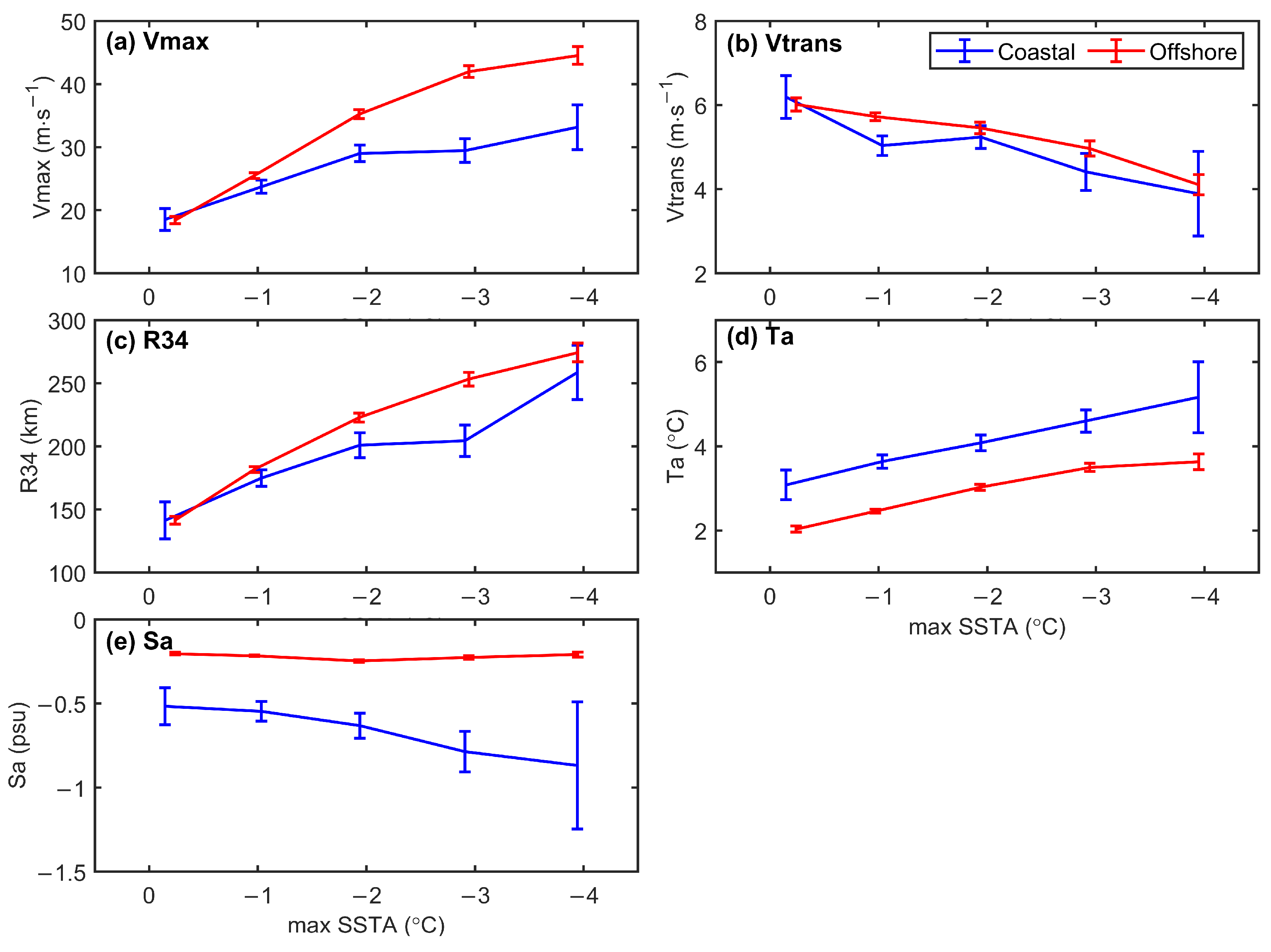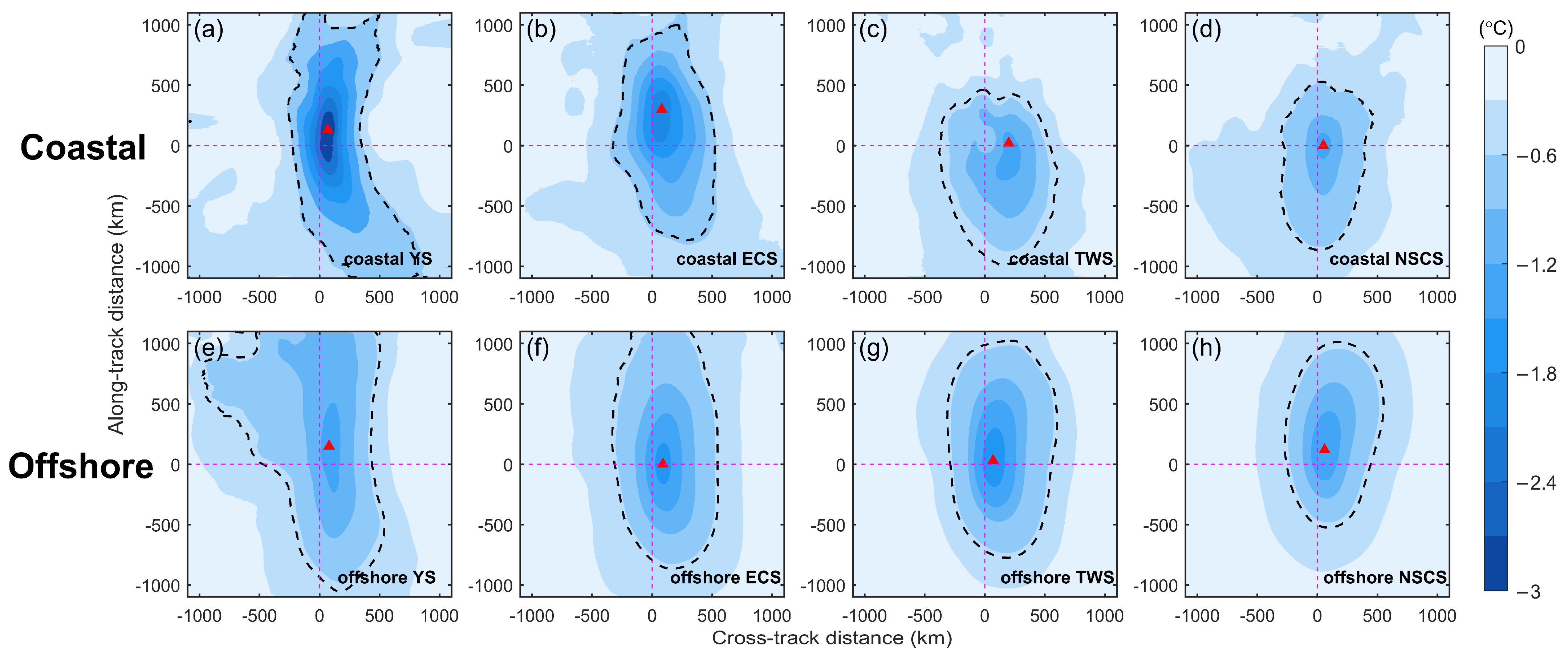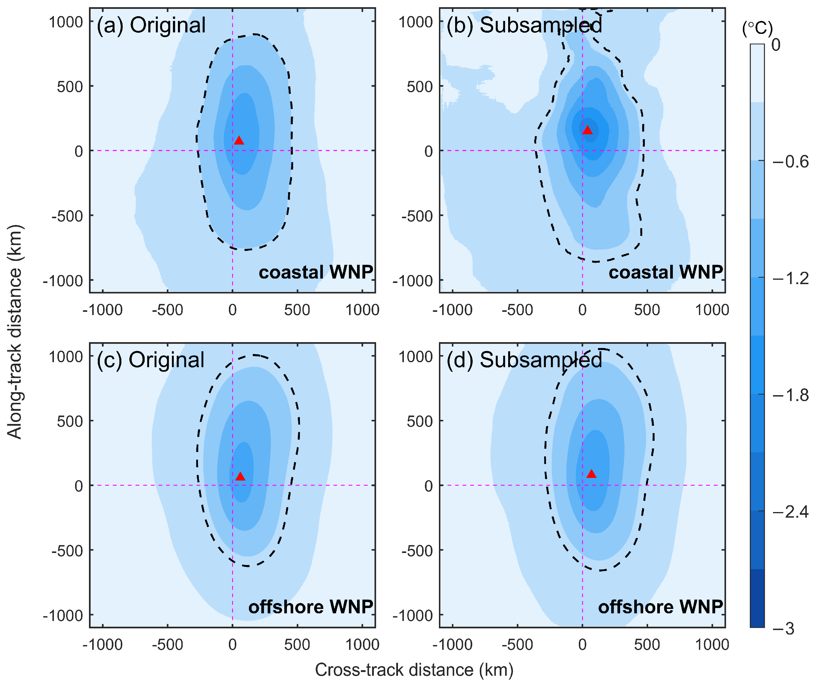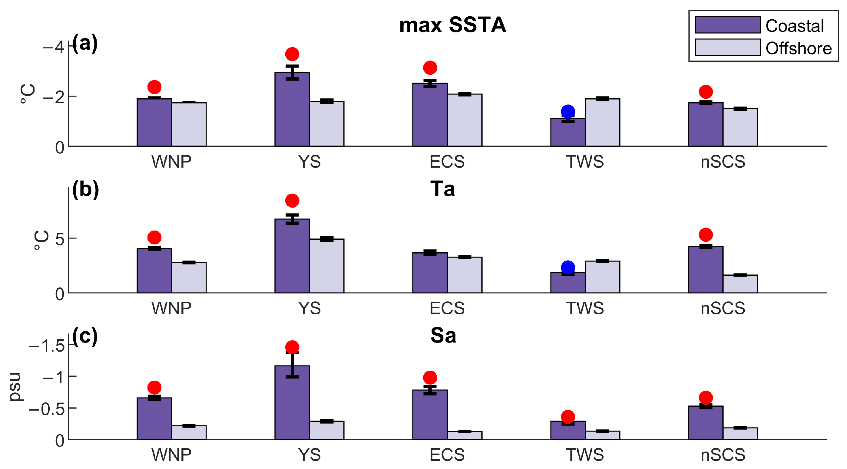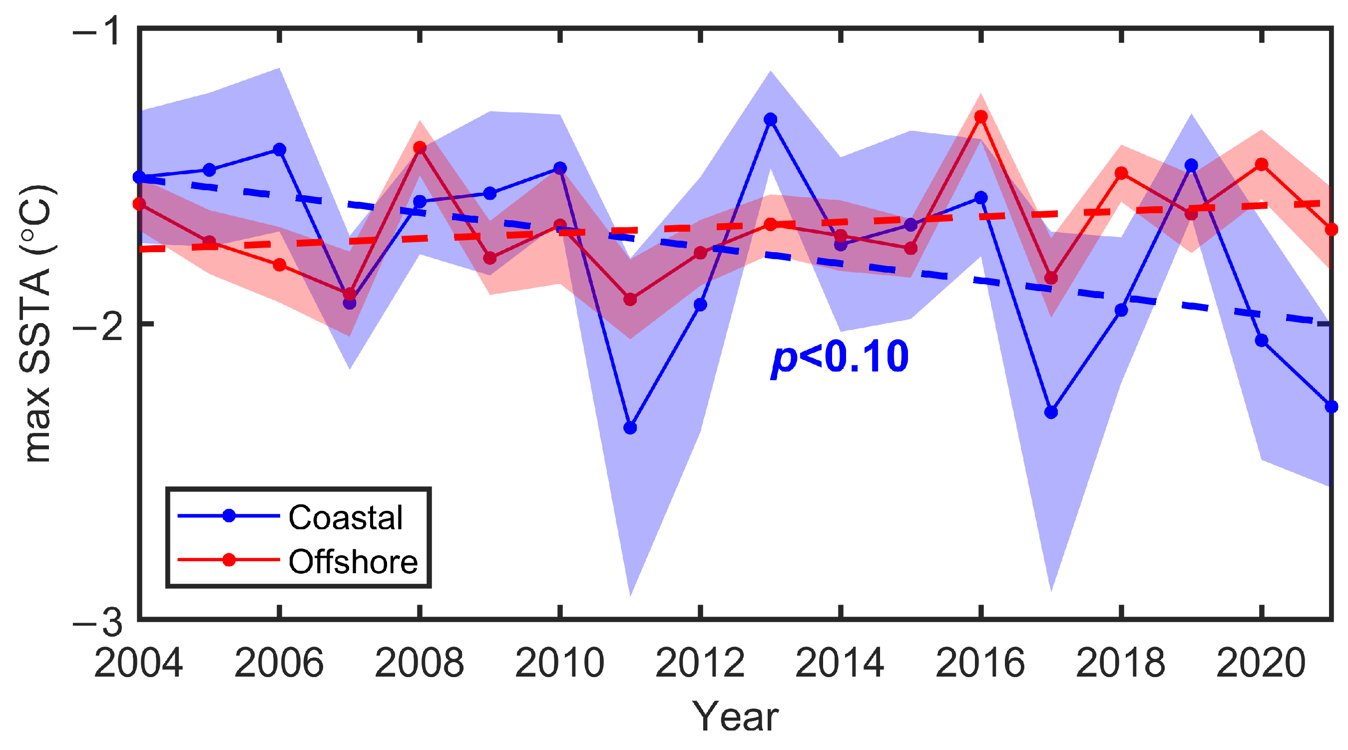 | Subsampled maximum SSTA (°C) | Coastal | −1.9 | −2.9 | −2.5 | −1.1 | −1.7 |