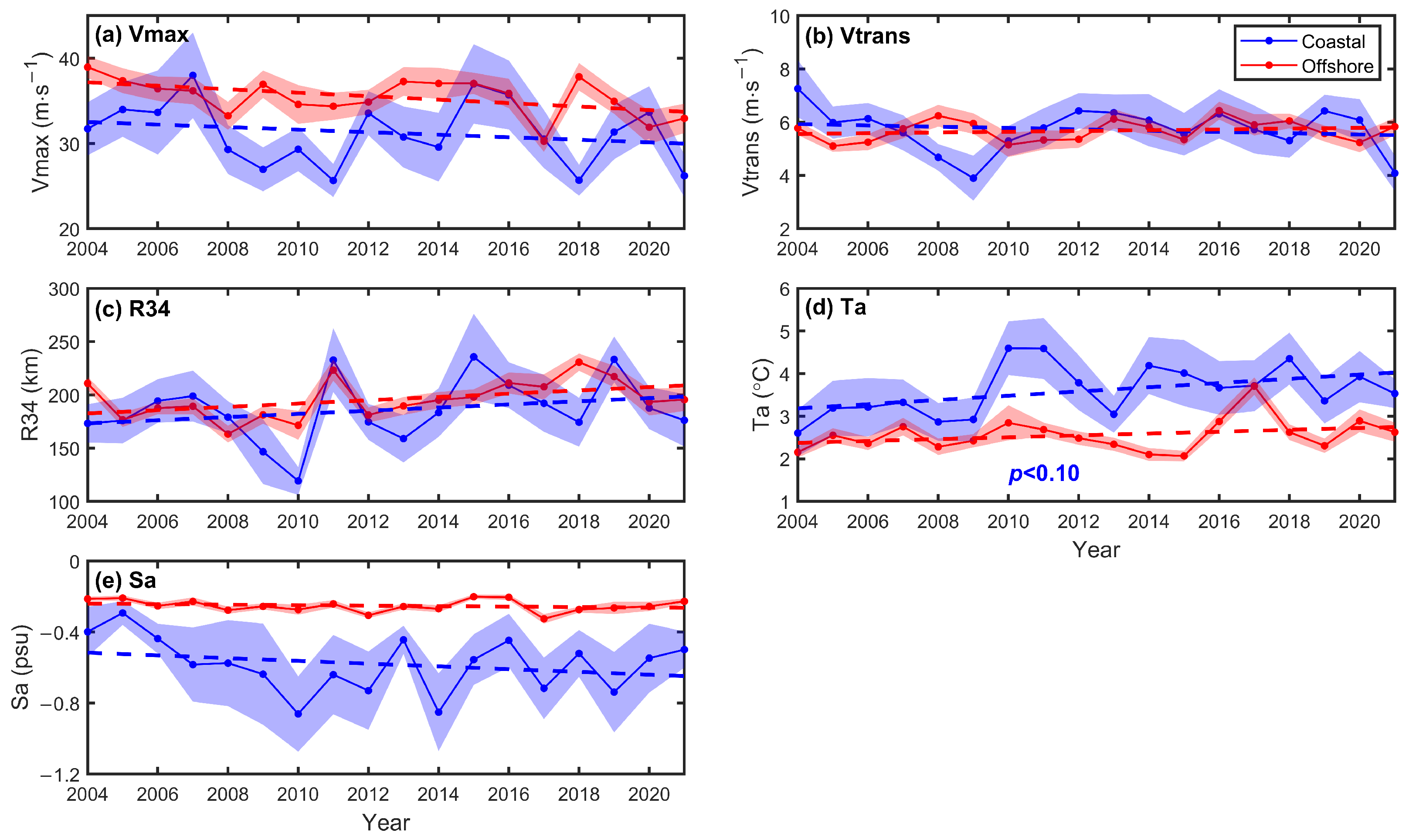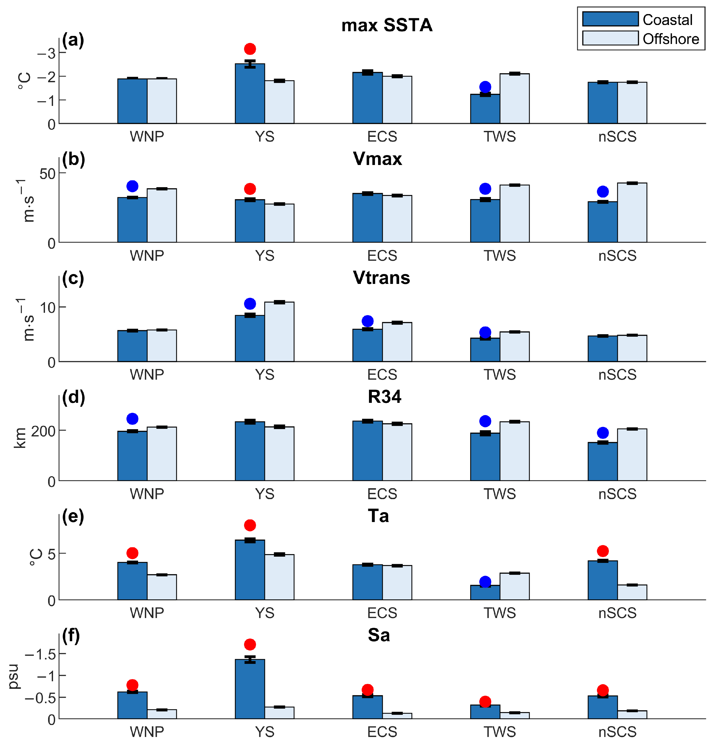 - Da, N.; Foltz, G.R.; Balaguru, K.; Fernald, E. Stronger Tropical Cyclone–Induced Ocean Cooling in Near-Coastal Regions Compared to the Open Ocean. J. Climate 2023, 36, 6447–6463. [Google Scholar] [CrossRef]