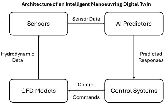 The architecture of an intelligent manoeuvring digital twin represents a closed-loop ecosystem that seamlessly connects physical ship operations with their virtual counterparts [36]. As shown in Figure 1, sensor data collected from onboard systems—such as position, velocity, engine load, and environmental conditions—continuously feed into CFD models that replicate the vessel’s hydrodynamic behaviour in real time. These CFD-based simulations generate high-fidelity responses to changing operational and environmental inputs, which are interpreted by AI predictors trained to recognise dynamic patterns, forecast vessel responses, and optimise control strategies. The refined predictions are transmitted to the ship’s control systems, which adjust propulsion, steering, or power management parameters accordingly. The resulting feedback from the physical vessel closes the learning loop, enabling continuous calibration of both the digital and physical models. This bidirectional data exchange allows the digital twin to evolve dynamically, ensuring that manoeuvring performance, energy efficiency, and regulatory compliance are continuously optimised during operation.