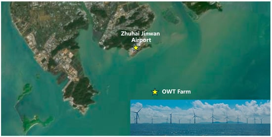This study focuses on an offshore wind turbine installed at the Biqing Bay Offshore Wind Farm, located near Zhuhai in Guangdong Province, China. The wind farm lies roughly 10 km from the shoreline, where the local water depth varies between 11.9 m and 20.9 m. With a total capacity of 300 MW, the farm comprises 55 turbines—most rated at 5.5 MW, except for a single unit whose output is limited to 3 MW. The geographical location and the overall arrangement of the wind turbines are as shown in Figure 1.
