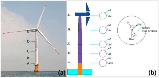 The selected turbine model has a rotor diameter of 157.7 m. Its operational wind speed range spans from 3 m/s at cut-in to 25 m/s at cut-out, while the rated wind speed of 10.1 m/s corresponds to a rotor speed of 12 rpm. As illustrated in Figure 2, turbine No. 29 is instrumented with a comprehensive monitoring system. This turbine adopts a monopile foundation that is linked to the tower through a transition piece. The tower consists of four cylindrical segments joined by bolted flanges, and the cross-sections are designated as Sections A to E from bottom to top. The monitoring system deploys a total of 10 uniaxial accelerometers, labeled “A1” to “A10”. Among them, A1 and A2 are installed on the E platform, A3 and A4 are installed on the D platform, and the remaining accelerometers are installed sequentially in the same order. The installation configuration of the accelerometers is shown in Figure 3, where the sensors are deployed in mutually perpendicular orientations. Accelerometers A1, A3, A5, A7, and A9 are arranged along the primary wind direction (northeast by east, 67.5° from true north), while the other sensors are oriented perpendicularly. The heights of sections E, D, C, and B relative to section A are 81.43 m, 56.38 m, 32.08 m, and 16.18 m, respectively. Additionally, the length of the monopile foundation is 85.5 m.