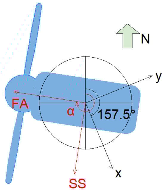 To maximize wind energy utilization, offshore wind turbine nacelles continuously adjust their nacelle orientation in response to wind direction changes. Since accelerometers are fixed installations whose orientations remain unchanged during yaw rotation, the acquired acceleration data must undergo coordinate transformation based on real-time nacelle orientation angle. As depicted in Figure 4, the relationship between the nacelle and sensor coordinate systems was established. According to the nacelle yaw angle data provided by SCADA, the acceleration measurements were converted into fore–aft (FA) and side–side (SS) vibration components to support the following modal parameter identification process. The specific formula is as follows: