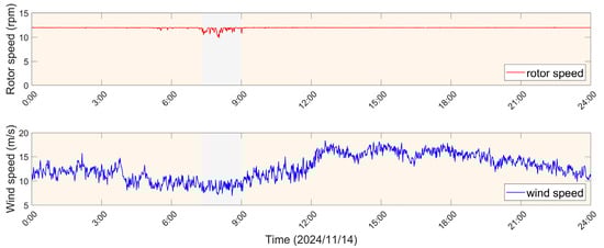 The rotor speed and wind speed data from SCADA system on 14 November 2024. The gray shaded area indicates a period of slight variations in rotor speed when the wind speed is below the rated value.
