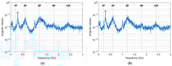 The singular value spectrum of the FA and SS direction acceleration time histories from 00:00 to 00:20 is presented in Figure 6. The spectrum clearly reveal the presence of higher harmonics caused by the blade rotation, with the vertical axis shown in logarithmic scale for better visualization. Additionally, it can be observed that the first-order bending frequency of the tower lies between the 1P (0.2 Hz) and 3P frequencies, indicating that the wind turbine exhibits a typical “soft-stiff” design [27]. It is noteworthy that the peak to the left of the 6P frequency corresponds to the 5P frequency rather than the second bending frequency. The second bending frequency does not appear prominently in the figure, likely due to interference from higher-order harmonics. This pattern is consistently observed under rated rotor speed conditions.