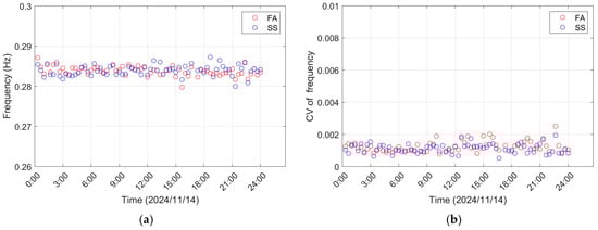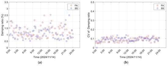 The complete set of daily acceleration data was analyzed to determine the frequencies, damping ratios, and their coefficients of variation, which are presented in Figure 7 and Figure 8. As shown in Figure 7, regardless of the FA or SS direction, the identified frequency results show slight fluctuations and remain generally stable, with the average frequency value in both directions being 0.284 Hz. Further statistical data are provided in Table 1. Additionally, BSD performed uncertainty quantification on the identification results, revealing that the coefficient of variation (CV) stays below 0.002, indicating high precision in the identified frequencies. Figure 8 presents the identified damping ratios at the rated rotor speed. Although a certain degree of dispersion can be observed, the statistical analysis shows that the mean damping ratio reaches 1.253% in the FA direction and 1.120% in the SS direction. The slightly higher damping ratio in the FA direction is mainly due to the stronger aerodynamic damping acting on the windward side. Furthermore, the coefficient of variation for the damping ratio identification results also remains at a relatively low level, though it is somewhat larger than that obtained for the natural frequencies. This is consistent with the expected behavior of modal parameter identification. The CV provides a practical metric of the reliability of identification results; with the established threshold of 15–20% [25]. Identified results with a CV exceeding this threshold should be treated with caution or discarded.
