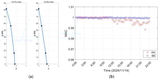 where and are two mode shape vectors, and T denotes the transpose operation. Figure 9a shows the mode shapes identified using acceleration time histories from 00:00 to 00:20. This result served as the reference for computing MAC values of all identified mode shapes. Figure 9b illustrates that all MAC values exceed 0.98, indicating the high reliability of the identification results.