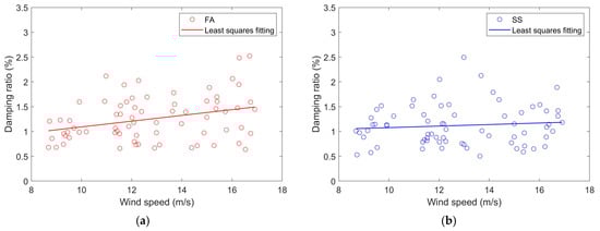 Variation in damping ratio with wind speed: (a) the damping ratios in the FA direction; (b) the damping ratios in the SS direction.