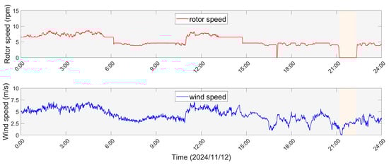 The rotor speed and wind speed data from SCADA system on 12 November 2024. The orange shaded area indicates a one-hour idling state.