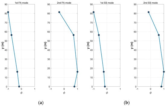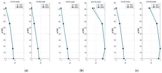 Comparison of Identified Mode Shapes: (a) Mode shapes at rated rotor speed; (b) Mode shapes in the FA direction at idle state; (c) Mode shapes in the SS direction at idle state.