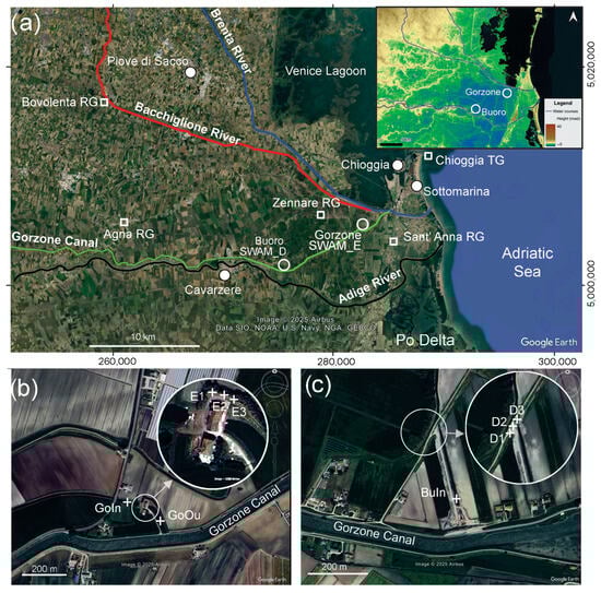 (a) Map of the study area showing the locations of the Gorzone (SWAM_E) and Buoro (SWAM_D) supersites (white circles), the Chioggia tide gauge (TG), the drainage-system nodes—Gorzone outflow (GoOu), Gorzone intake (GoIn), and Buoro intake (BuIn)—and the rain-gauge stations of Sant’Anna (RG), Zennare (RG), Agna (RG), and Bovolenta (RG). The Gorzone Canal is shown in green, the Adige River in black, the Brenta River in blue, and the Bacchiglione River in red. Main urban centers are indicated with white dots. A digital elevation model (TanDEM-X 30m) of the study area is shown as an inset [22]. Projection: UTM Zone 33N (WGS84). Close-up maps of the Gorzone supersite (b) and Buoro supersite (c) show the locations of piezometers E1–E3 and D1–D3, respectively.