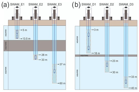 Sketch of the main hydro-stratigraphic units, screened sections, and probe positions: (a) supersite Gorzone (SWAM_E piezometers) and (b) supersite Buoro (SWAM_D piezometers).