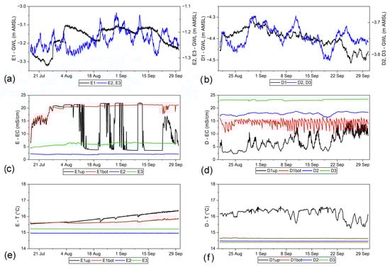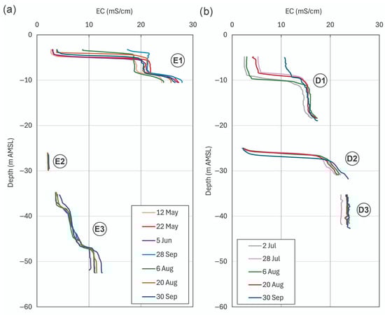 The piezometers were equipped with fixed CTD sensors (E1up, E1bot, E2, E3, and D1up, D1bot, D2, D3) connected to near–real-time telemetry systems. In piezometers exhibiting a well-stratified water column and the characteristic knee-shaped EC profile associated with a saline interface, two sensors were installed—one in the upper part and one in the lower part of the aquifer—to resolve vertical variability in groundwater levels and salinity (Table 2 and Figure 2).
