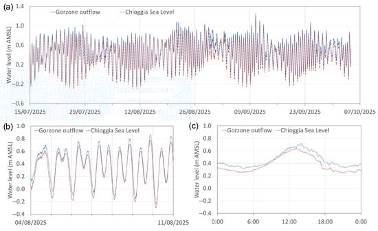 Comparison between tidal fluctuations at Chioggia (used as a proxy for sea level) and water levels in the Gorzone Canal at the outflow of the Gorzone pumping station. (a) Time series from July to October 2025 shows the clear tidal modulation of canal water level; (b) detailed view (4–11 August 2025) highlights the semi-diurnal tidal signal; (c) zoomed-in hourly pattern illustrates the phase lag of tidal propagation between sea level and the water level at the Gorzone outflow station.