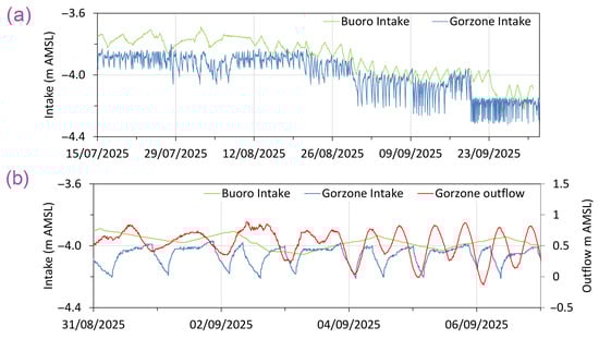 Water levels at the Gorzone and Buoro pumping stations for July–September 2025 (a), and 1-week zoom (31 August–7 September 2025) showing intakes (left axis) and outflow (right axis) (b).