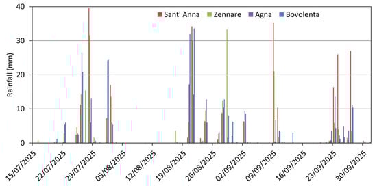 Daily cumulative precipitation recorded at the Sant’Anna, Zennare, Agna, and Bovolenta meteorological stations.