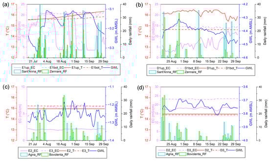 Time-series comparison between the Gorzone (SWAM_E) and Buoro (SWAM_D) supersites (left and right panels, respectively) and daily rainfall recorded at the nearby Sant’Anna and Zennare stations (phreatic recharge) and the inland Agna and Bovolenta stations (confined recharge). Groundwater level (GWL), electrical conductivity (EC), and temperature (T) are shown for (a,b) phreatic aquifers and (c,d) confined aquifers.