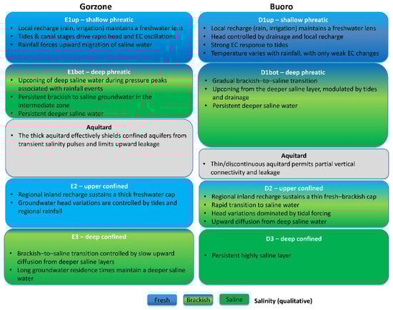 Conceptual model of the vertical groundwater salinity structure and controlling processes at the Gorzone (left) and Buoro (right) sites. For each site, the shallow and deep phreatic (E1up/D1up, E1bot/D1bot) and upper and deep confined aquifers (E2–E3; D2–D3), separated by an aquitard of variable thickness and continuity, are summarized in terms of dominant recharge mechanisms, tidal and drainage forcing, vertical leakage, and the persistence of fresh, brackish and saline groundwater. Colors indicate qualitative salinity classes (fresh, brackish, saline).