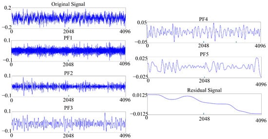 The key parameters listed in Table 1 control the behavior and stopping criteria of the LMD decomposition. First, to mitigate edge effects, the signal endpoints are treated as pseudo-extrema, enabling a stable estimation of the local envelope and mean near the boundaries. Within the inner sifting process, a maximum of N s m o o t h = 12 smoothing iterations and N e n v = 200 envelope iterations are permitted for each PF. To prevent excessive computation without significant quality gain, the sifting terminates early if the variations in the envelope and modulation signal fall below the tolerances ε e n v = 0.01 and ε c o n v = 0.01 , respectively. Globally, the decomposition depth is capped at N P F , m a x = 8 , ensuring that only a finite number of physically meaningful oscillatory modes are extracted. For the subsequent feature extraction, only the first five components (PF1–PF5) and the final residual are retained, as shown in Figure 2. This selection is justified because these initial components capture the majority of the vibration energy and fault-related modulation signatures, whereas the discarded higher-order PFs primarily represent slowly varying trends with negligible diagnostic value.
