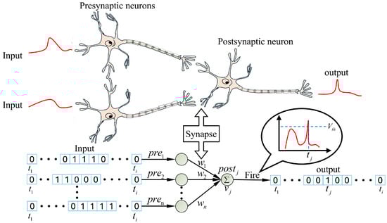 When a postsynaptic neuron receives any incoming spike, its membrane potential increases accordingly. The function of this membrane potential is the continuous accumulation and integration of all received signals over time. Once the neuron’s membrane potential reaches and surpasses a predetermined firing threshold, it immediately responds by emitting a new output spike. Immediately thereafter, the neuron’s membrane potential is reset to its resting potential state in preparation for the next round of information processing. The architectural design of the SNN and this event-driven spike generation and reset mechanism are illustrated in detail in Figure 3.