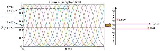 The final feature F is then encoded into a spike sequence A i = A 1 , A 2 , , A N . For instance, a normalized real-valued feature of 0.557 is encoded within a Gaussian receptive field consisting of 20 neurons. Subsequently, the activation values are sparsely filtered using the Adaptive Threshold mechanism and the k-WTA competitive strategy, yielding a sparse output vector ( { 0 , , 0.441 , 0.459 , 0.029 , , 0 } ). This encoding and competition process is detailed in Figure 4.