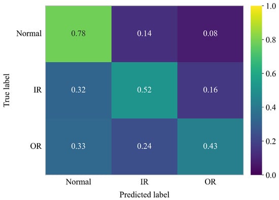 The t-SNE visualization in Figure 8 provides an intuitive confirmation of this difficulty, showing that the fault sample clusters are heavily intertwined and almost indistinguishable from the healthy baseline. The confusion matrix in Figure 9 further supports this observation from a quantitative perspective, revealing a systematic failure of the model to detect faulty conditions. Specifically, although the “normal” condition is recognized with an accuracy of 78%, a substantial portion of faulty samples are misclassified as “normal”: 32% of inner-race (IR) faults and 33% of outer-race (OR) faults are incorrectly predicted as healthy.