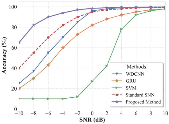 In contrast, the Proposed Method achieved the best performance across all noise levels and showed remarkable stability under severe noise. At 0 dB, it still achieved 98.5% accuracy; at −4 dB, the accuracy remained at 94%, whereas the standard SNN and WDCNN dropped to approximately 82% and 70%, respectively. Even under the extremely harsh condition of −10 dB, the proposed method maintained an accuracy of about 65%. These results clearly demonstrate the strong robustness of the proposed approach under severe noise interference, confirming its ability to effectively extract and discriminate fault features that are heavily masked by noise.