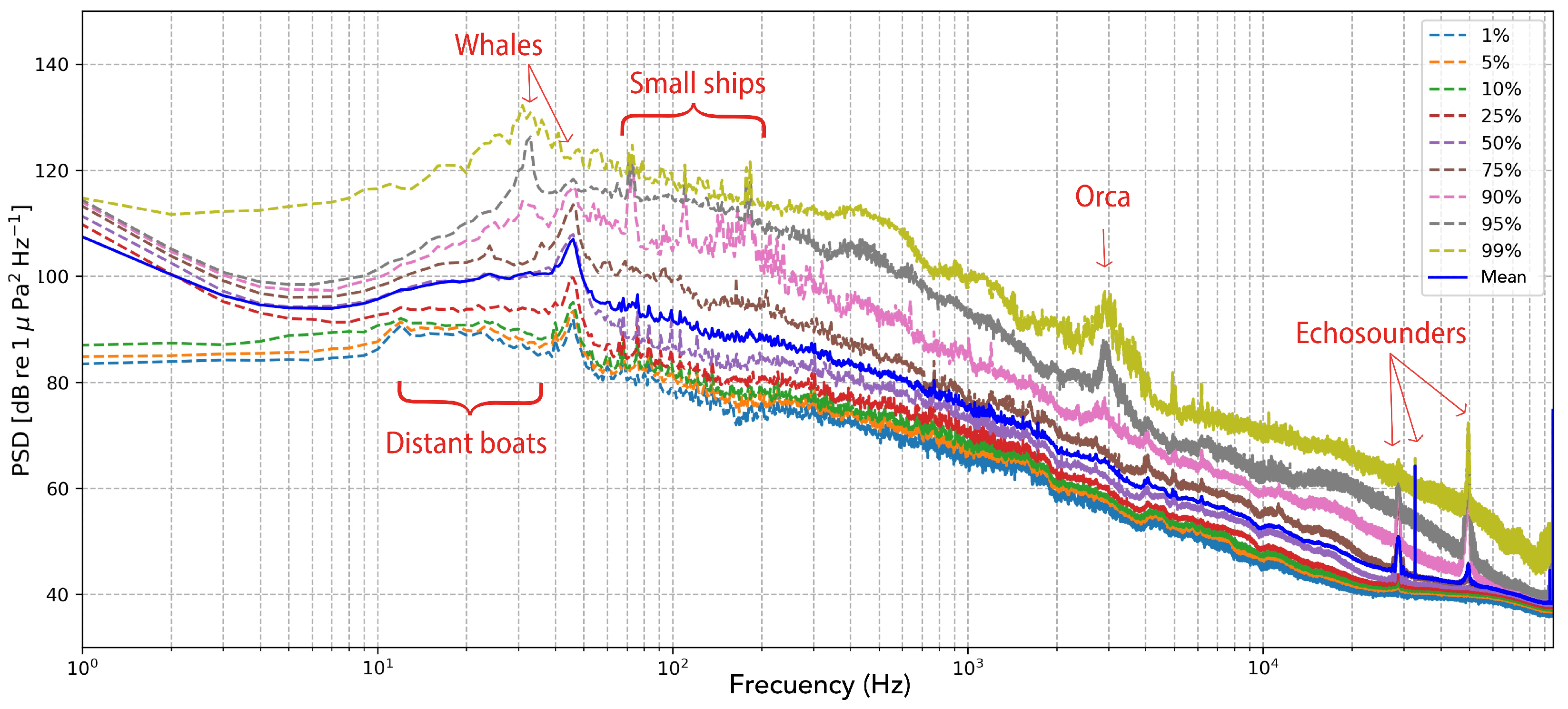 Figure 2), providing an overview of the temporal and spectral variability throughout the drifting experiment. The power spectral distribution revealed broad low-frequency peaks between 30 and 50 Hz, which were consistently present across all PSD percentiles and are therefore interpreted as a pervasive biological component of the soundscape, likely produced by large marine fauna. Additionally, the PSD curves exhibited a general elevation of background energy between 10 and 60 Hz, compatible with the continuous passage of large commercial vessels through the Strait. Although this low-frequency energy was not sufficient to mask the biological sounds, it was consistently present across the entire recording, raising the overall spectral baseline in that range, as clearly visible even in the lowest percentiles of the PSD plot. In contrast, narrower peaks between 70 and 110 Hz appeared only above the 90th percentile, suggesting intermittent anthropogenic sources such as small vessel engines sailing relatively closer to the buoy. Similarly, acoustic energy within the 2–4 kHz band—corresponding to killer whale pulsed sounds—was only detectable above the 90th percentile, indicating that orca vocalisations were occasional rather than continuous during the drift. Conversely, tonal energy in the frequency range associated with echosounder emissions was evident in more than half of the temporal segments, highlighting the persistent presence of these high-frequency anthropogenic signals within the regional soundscape.