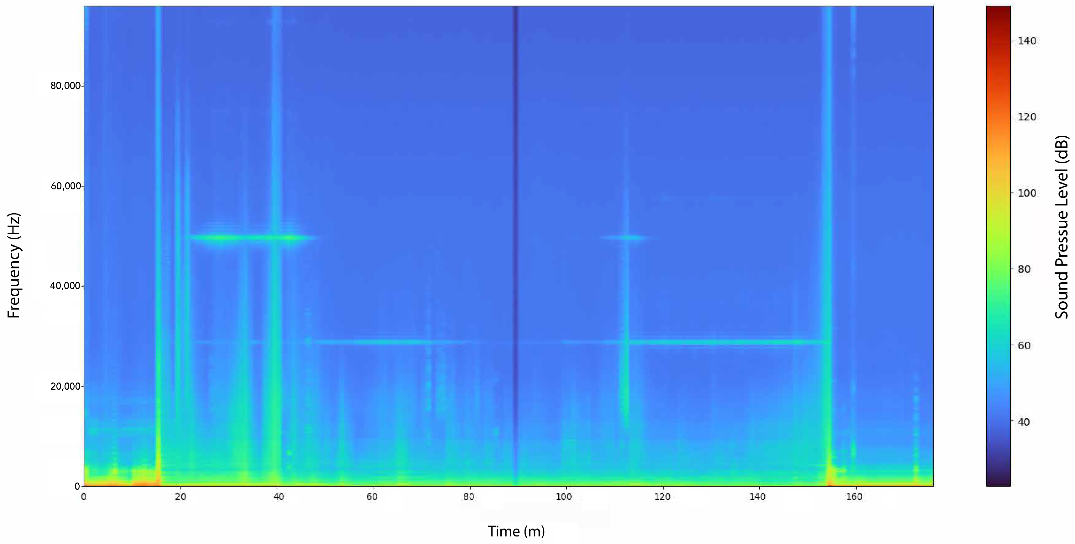 In addition to the PSD, a long-term spectrogram was generated to provide a comprehensive visual representation of the acoustic activity recorded throughout the entire experiment. The spectrogram was computed using a custom Python (version 3.12.2) routine based on the matplotlib (version 3.9.2) and numpy (version 1.26.4) libraries, with data segmented into consecutive analysis windows to preserve both temporal and frequency resolution. The analysis covered the full bandwidth of the SoundTrap ST400 recorder (0–96 kHz), enabling the detection of a wide range of acoustic sources.