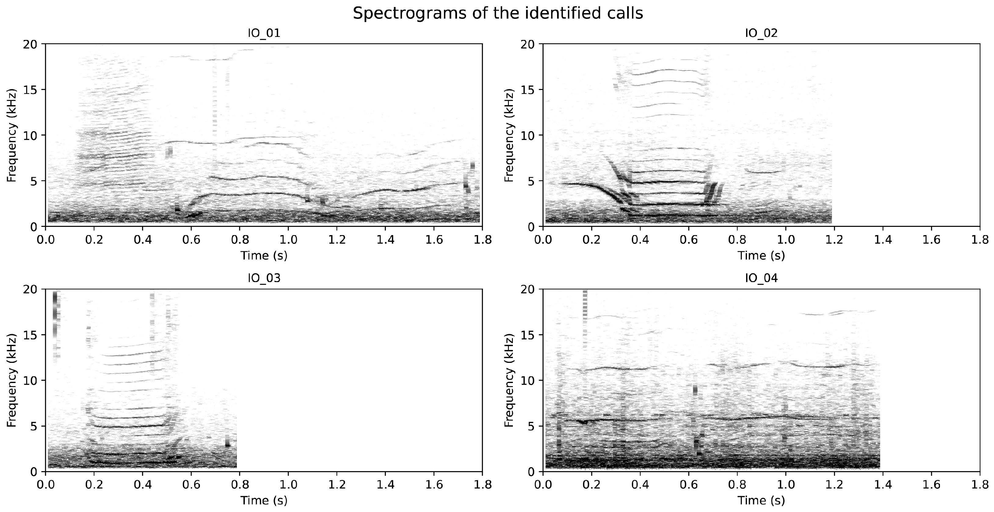 Figure 4). These call types were designated as the Iberian Orca (IO) series: IO_01 (22 calls), IO_02 (10 calls), IO_03 (6 calls), and IO_04 (4 calls). Many calls displayed the characteristic dual-component structure typical of killer whale vocalisations, including clearly defined low-frequency (LFC) and high-frequency components (HFCs), and in several instances, subtle sideband structures (SBI) [