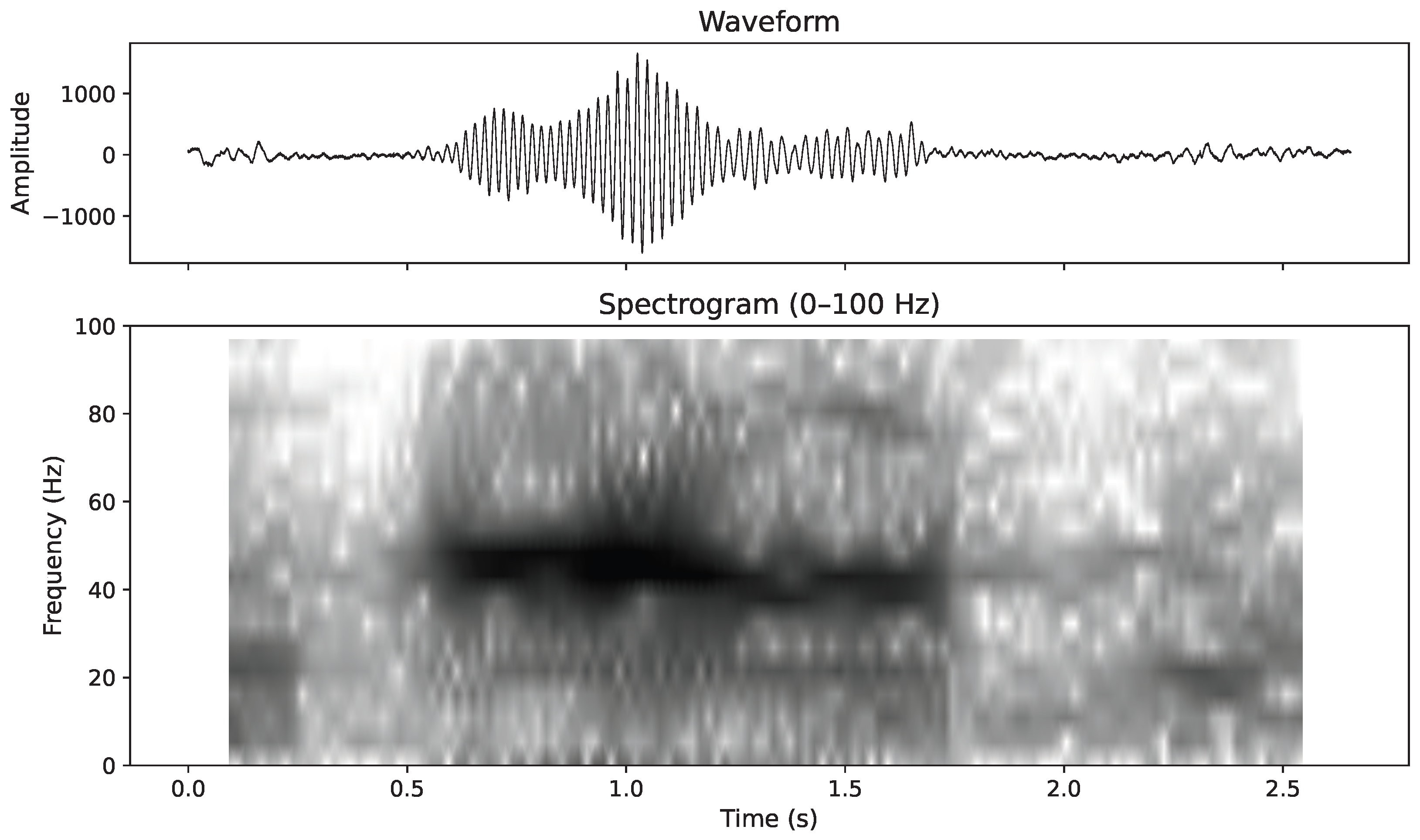 P. macrocephalus). For low-frequency baleen whale vocalisations, the waveform segments showing tonal or rhythmic oscillations were further analysed in low-frequency spectrograms (0–200 Hz) to confirm the presence of concentrated acoustic energy in the expected bands, typical of fin whale and other mysticete calls [