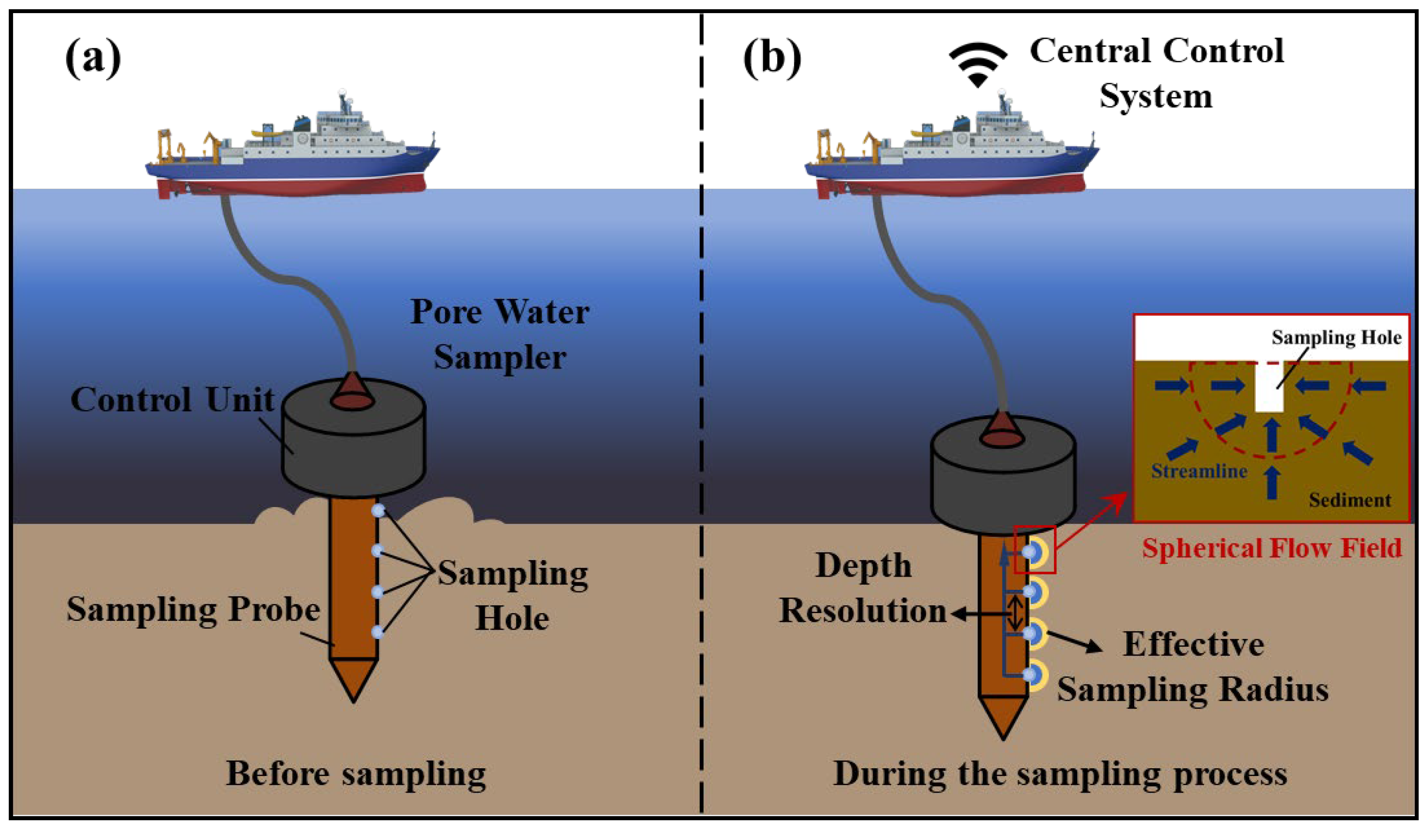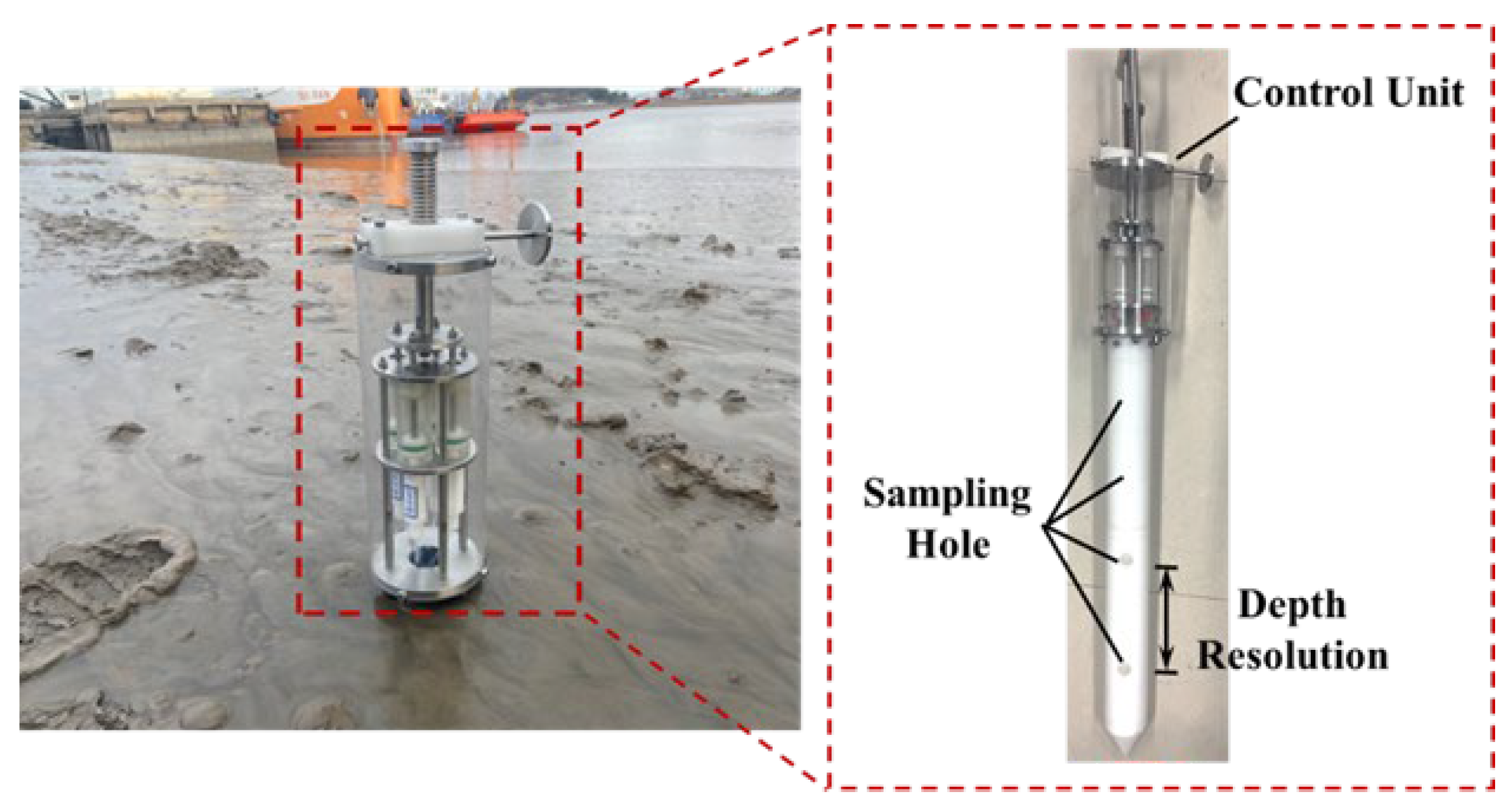 - Wang, Y.; Tan, X.; Lin, X.; Fang, Y.; Lin, Y.; Chen, J.; Wang, Y.; Sun, Y. An in-situ portable pore-water sampler for evaluating the vertical distribution in the sediment interface. Mar. Georesources Geotechnol. 2024, 43, 93–100. [Google Scholar] [CrossRef]