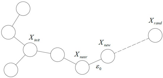 where C f r e e is the free space, C o b s is the obstacle space. Meanwhile we define the initial position and target position as X i n i t and X g o a l , respectively. Then choosing the X i n i t as root node of the random tree and X r a n d is randomly sampled from the configuration space. Next, selecting a nearest node to X r a n d from all the node in the random tree named X n e a r , a distance of ε 0 is extended from the direction of X n e a r to obtain a new node named X n e w . During the extension process, if X n e w C o b s , X n e w will be accepted and will be added as a node of the tree; if X n e w C o b s , X n e w will be discarded and X r a n d will be generated again. Through such continuous extension and expansion, when the distance from the node of the random tree closest to the X g o a l to X g o a l is less than or equal to ε 0 , the construction process of the random tree can be regarded as successful. The schematic diagram of the construction process is shown in Figure 1.