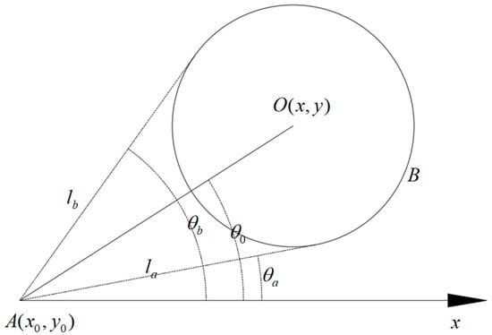 When we consider the situation of the USV collision avoidance, the most basic thing is the environment modeling. USV can obtain environmental information through radar, AIS, and other equipment when performing navigation tasks. Through the environmental information, the bearing, shape, and other information of the obstacles that hinder the safe navigation can be extracted and stored; then, we can build USV–Obstacle environmental model to determine collision area as shown in Figure 2. At time t, the USV A emits rays l a ( ρ , θ a ) and l b ( ρ , θ b ) to the tangential direction of obstacle B. The relative velocity of USV and obstacle is v R , the angle between v R and the x-axis is θ R . The obstacle B center coordinates are (x, y). The following mathematical relationships exist: