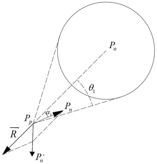 Formula (13) shows that when the extension direction of the parent node P p is within the cone collision area, USV has a dangerous heading. The ‘obstacle repellent vector’ R dynamically adjusted the original extension of search tree in the direction of the line from P o to P p according to the collision avoidance risk coefficient ω , increasing the tendency of the extension of the search tree to stay away from obstacles. This process can be geometrically expressed as in Figure 3.