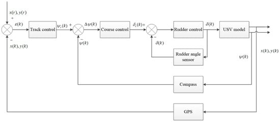 The cascade control structure adopted by the USV avoidance path point tracking is shown in Figure 6. The control strategy is based on the idea of feedback control and three-level control; the outermost track control loop is compared with the planned collision avoidance path point based on the current position x ( k ) , y ( k ) of the USV to calculate the track deviation ε ( k ) ; the deviation signal is input into the track control LOS algorithm to obtain a heading control signal ψ r ( k ) that the algorithm believes can eliminate the track deviation; after receiving the control signal, the central course control loop inputs ψ r ( k ) and ψ ( k ) into the course control PID algorithm for solution, and obtains the rudder angle control signal δ r ( k ) ; the innermost rudder angle control ring drives the servo system to make the actual rudder angle consistent with the commanded rudder angle. The idea of control divides the track deviation problem into three levels, which improves the robustness of the collision avoidance tracking control system.