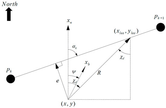 In the LOS algorithm, continuously calculating the desired heading angle χ d ( e ) to make USV’s heading always directed toward the target point p l o s ensures that the lateral tracking error e gradually approaches 0, so that the ship can track the planned points.