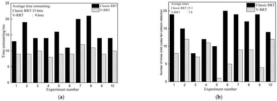 Figure 8. Time consuming comparison (a) and number of times child nodes fail collision detection comparison (b).