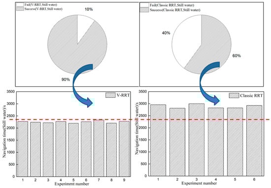 Ten groups of waypoints planned by the algorithms before and after improvement were tracked by introducing 3-DOF nonlinear equation of the ship in still water. Final results of statistical comparison of each group of tests are shown in Figure 10. Both tracking strategy and algorithm adopt cascade control and LOS navigation algorithm described in Section 4.4, and control parameters and control laws are identical. From Figure 11, it can be seen that although in the planning level, all planned waypoints of both algorithms fall beyond the obstacle zones as shown by the test results in 5.1, for the final actual course presented by classical RRT algorithm, a number of groups passed through the obstacle zones during tracking simulation tests. According to the statistical results, relative to rate of success in collision avoidance in actual course obtained by classical RRT algorithm, rate of success provided by V-RRT algorithm is 30% higher and reaches 90%. This indicates that in actual application in voyage, the improved algorithm provides higher reliability by significantly reducing both the probability of collision accidents and operation difficulty of the USV. According to Figure 10, navigation time with V-RRT algorithm is far less than that with classic RRT algorithm. Average navigation time with V-RRT algorithm is 2258.5 s and is 22% less than the navigation time of 2890.8 s with the classic RRT algorithm. This implies that with waypoints obtained from the V-RRT algorithm, collision avoidance may be conducted in less time, which implies important significance for the ship with regard to energy saving.
