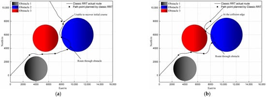 Figure 11. Typical collision avoidance failure path of classic RRT: unable to recover initial course (a), at the collision edge (b).