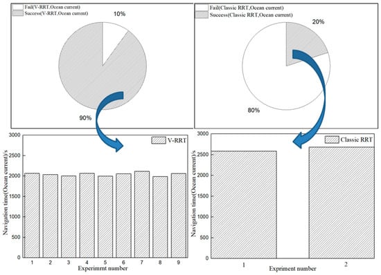 Similarly to Section 5.1, ten groups of waypoints planned with the algorithms before and after improvement were tracked under current load and identical control parameters and law. Figure 13 displays the comparison of key indicators of actual routes under current load. It can be seen that after current load is introduced, the rate of success in collision avoidance in actual route obtained from the classic RRT algorithm is further reduced from 60% to 40%, and half of them could not return to the pre-set course, while waypoints planned by V-RRT present favorable anti-interference capability and robustness with success rates the same as the success rates in still water.