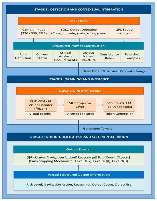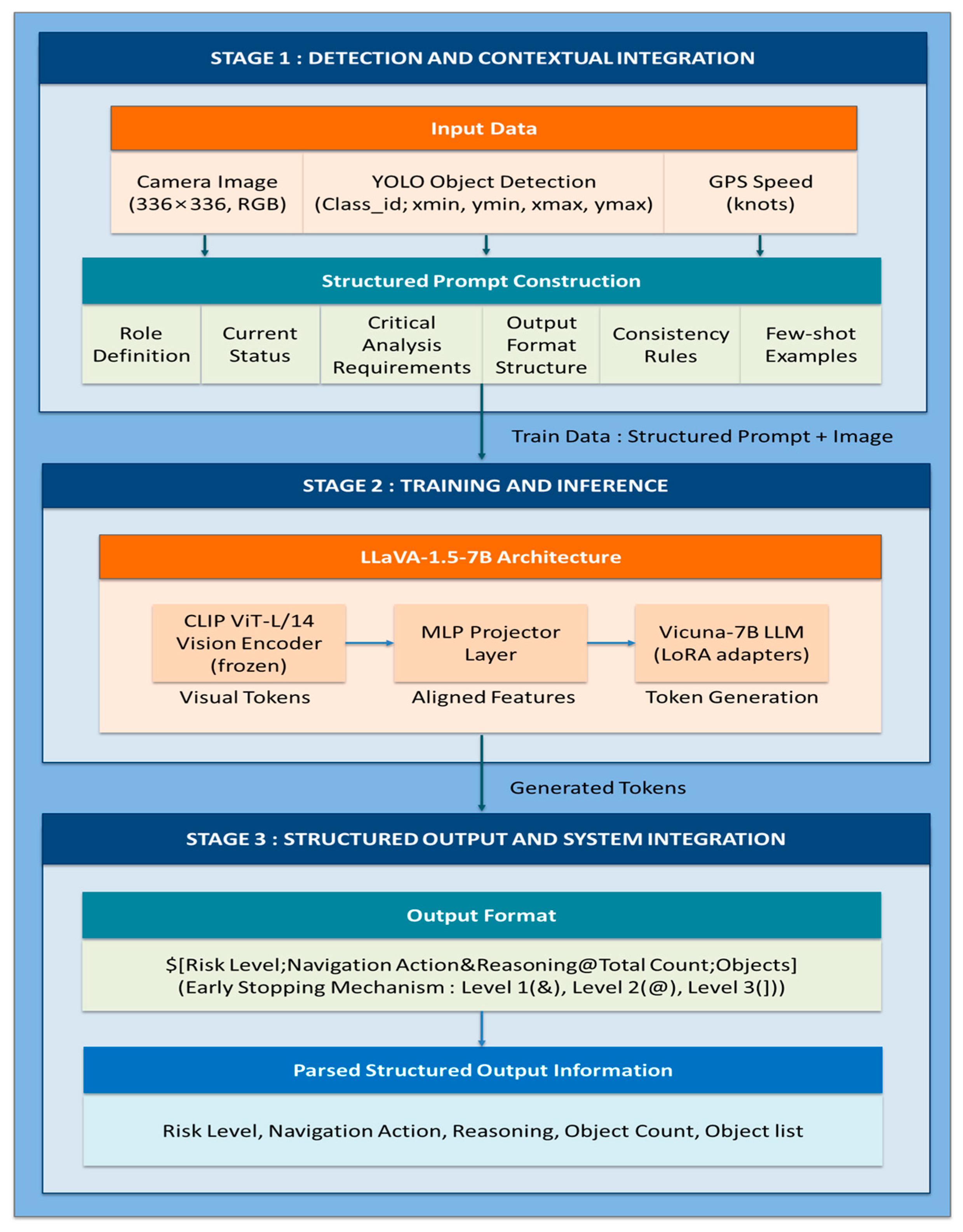 19]. The WaterScenes dataset provides 54,120 images captured in various aquatic environments along with annotations for seven object classes (ship, vessel, boat, kayak, pier, buoy, sailor) commonly seen at sea. However, most object detection datasets, including WaterScenes, provide only object location and type information, not including high-level semantic information such as what danger that object poses to current navigation or what action should be taken. Therefore, object detection alone is insufficient to build a complete navigation safety assessment system, and additional research connecting detection results to interpretation and decision-making is necessary. In this study, we enriched the WaterScenes dataset with additional annotations based on its existing images and object information to support vision–language model training. The new labels include risk level classification, recommended navigation actions, and explanatory reasoning for each scenario. Third, this study performs Parameter-Efficient Fine-Tuning (PEFT) using the LoRA technique based on the VLM model (LLaVA-1.5-7B), achieving token lightweighting to enable real-time inference even on edge platforms such as NVIDIA Jetson Orin. Along with this, an early stopping-based structured prompt engineering technique was designed to enable hierarchical output of information at the level of 6–70 tokens depending on the situation’s urgency. Fourth, explainability was enhanced by incorporating a reasoning field that explicitly captures the basis for AI decisions. Overall, this structured prompt and output design enables VLMs to assess safety, recommend navigational actions, and justify their decisions, contributing to the development of practical and robust maritime navigation safety systems.