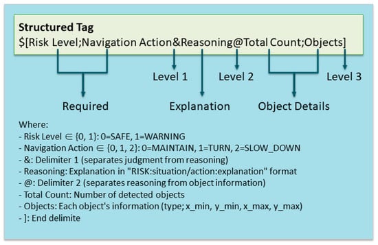 One of the core contributions of this study is the design of the structured tag system. Most existing vision–language models generate responses in free-form natural language, which is suitable for conversation with humans but causes several problems in integration with autonomous systems. First, natural language is inherently ambiguous. Expressions like “caution is needed, there may be danger, be careful” do not clearly convey quantitative risk levels. Second, natural language parsing is complex and error-prone. Parsing “I recommend turning left” requires multiple steps including natural language understanding, syntactic analysis, and semantic extraction. Third, natural language has low token efficiency. More words are needed to convey the same content, and in autoregressive generation, time increases proportionally to the number of tokens. Fourth, consistency verification is difficult. It is hard to automatically detect logical contradictions like “safe but avoid.”