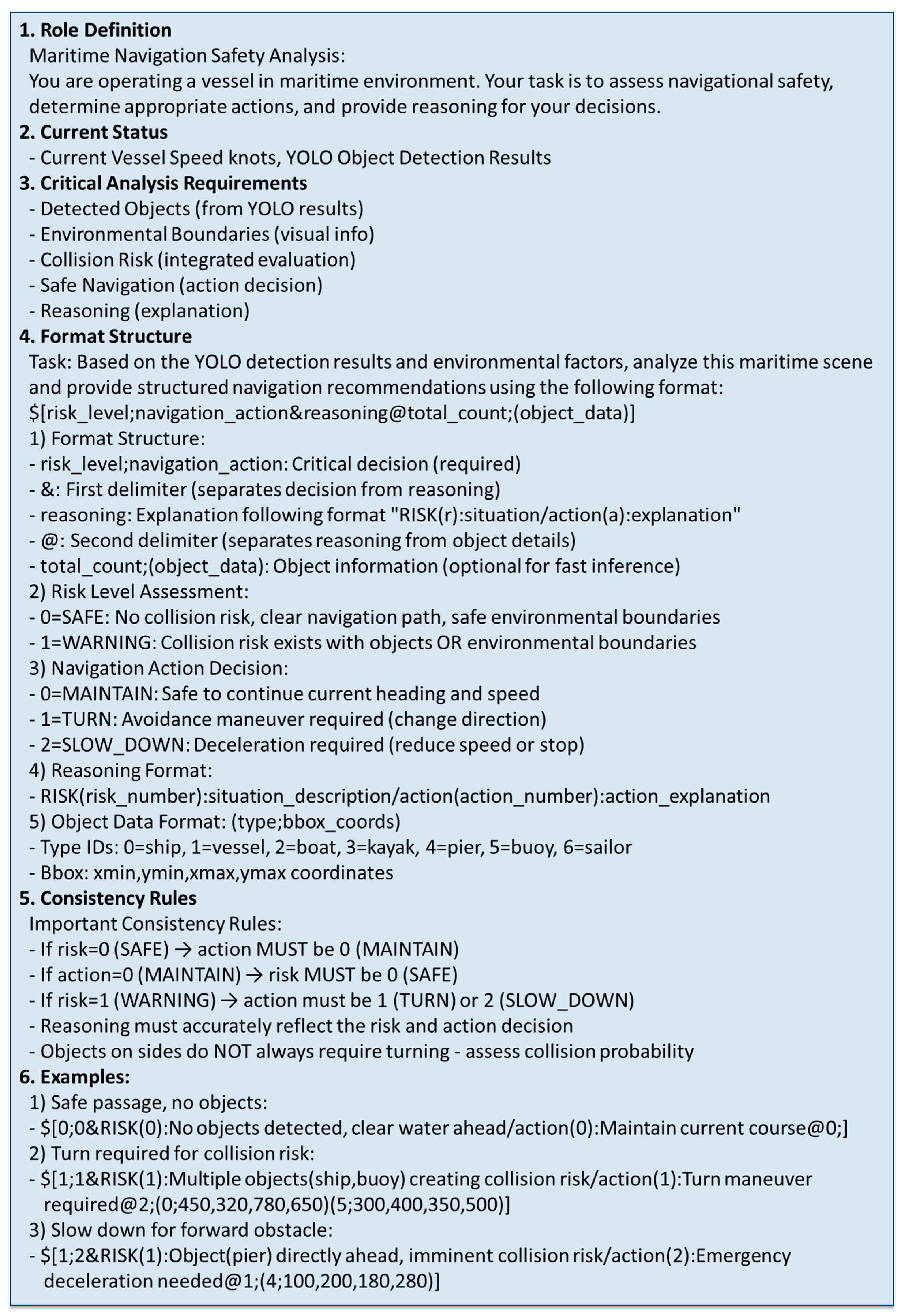 This study uses speed and object Ground Truth data from the WaterScene dataset. The core purpose of this study is to verify how well a vision–language model based on domain-specific input and output prompts can perform maritime safety assessments and navigation decisions when given accurate object information, not to evaluate YOLO object detector performance. By using Ground Truth of object and speed data, errors in the object detection stage are eliminated, allowing pure measurement of only VLM’s scene understanding, risk assessment, and decision-making capabilities. This presents the theoretical upper bound of VLM and shows the potential achievable when object detection technology improves in the future. Then, it is important to precisely construct a contextual prompt including detection results. The prompt structure proposed in this study is designed in a domain-specific manner and is a sophisticated prompt structure organized stepwise to increase model judgment reliability and structured responses. This prompt plays a role beyond simple question-answering, inducing a simulation thought flow similar to actual ship operators, with each component hierarchically providing information that the model should consider in its judgment process. As shown in