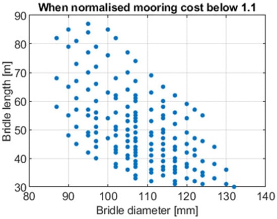 74] conducted a parametric study on bridles for a 15 MW spar-type floating offshore wind turbine in catenary configuration using chain lines at a moderate water depth site. The study identifies that chain diameter, grade, and line length are critical parameters influencing mooring costs. A set of over 100 cost-effective bridle configurations was produced and their relationships between bridle length and diameter are shown in