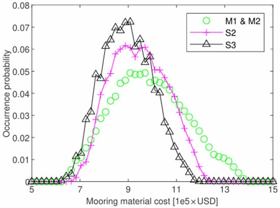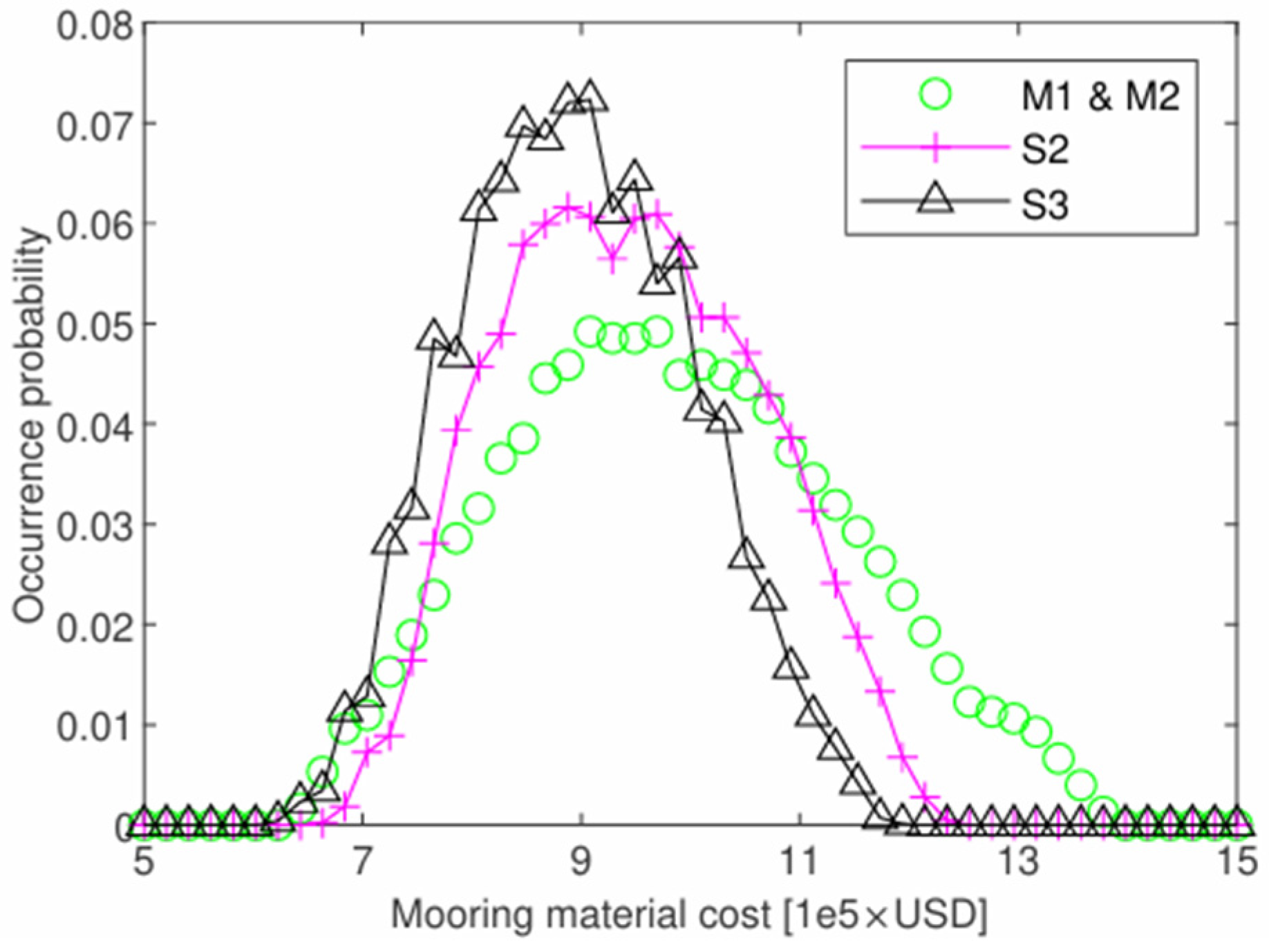 75] developed a comprehensive design methodology for shared mooring line configurations at a moderate water depth site, demonstrating that shared lines can significantly reduce procurement costs. The methodology generated many different conventional configurations for single turbine and shared mooring configurations for two- and three-turbine arrays. Chain mooring lines were once again considered in the analysis. The cost distribution based on the generated models is presented in